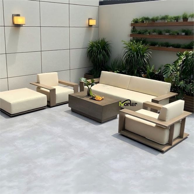 5. Tikmedžio lauko sofa: Pagaminta iš itin atsparaus oro sąlygoms natūralaus tikmedžio, ši sofa pasižymi smulkiu grūdeliu, dideliu stabilumu ir suteikia prabangesnį pojūtį naudojant, todėl tai yra klasikinis pasirinkimas kuriant aukščiausios klasės kurorto stiliaus balkoną.